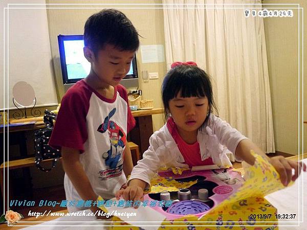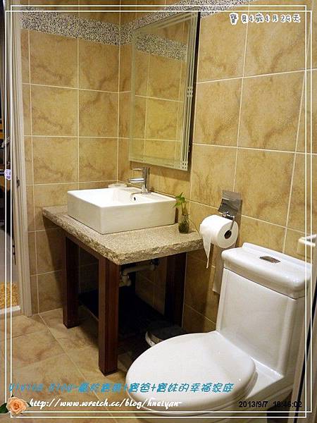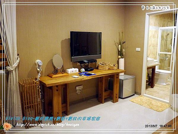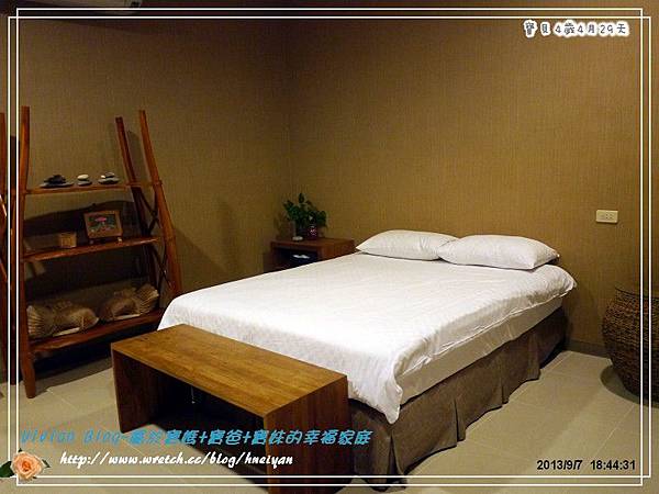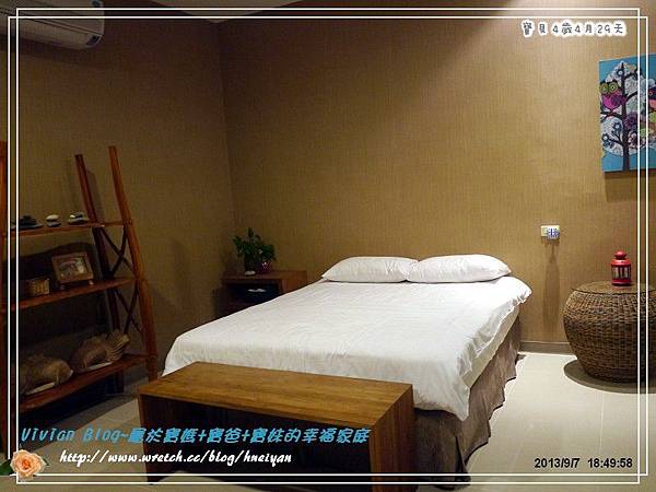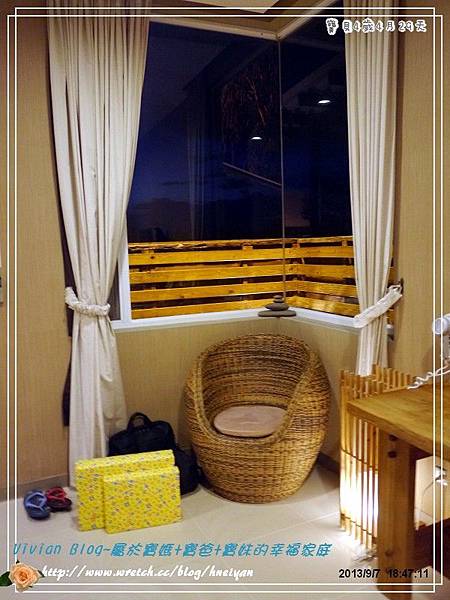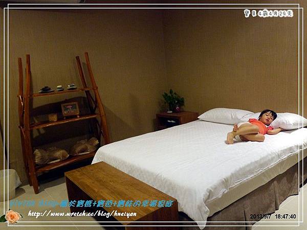 我覺得這房間空間大小算寬敞,唯一最大缺點就是,他們的床是5*6的標準床,這可辛苦了寶爸及我,還好我很機靈,把放在床頭的腳凳轉移了一個方向,我們出門都是把床改睡成橫的,這樣比較寬敞,而寶爸的腳可以放在腳凳上,稍微舒服一點。