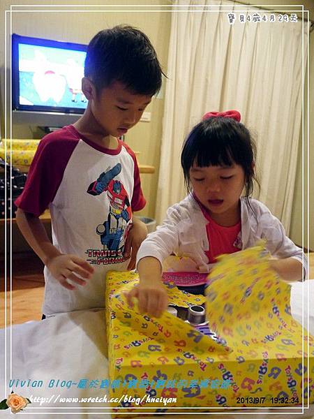 每年與好朋友相見,我們都會準備禮物讓孩子們互相交換,今年也不例外,我們準備了閎閎格格指定的軌道遙控汽車、彭彭弟弟則是兒童餐具加打地鼠玩具,好朋友則送了寶妹夢寐以求的直立式麥克風,三個孩子拆玩具可開心呢。