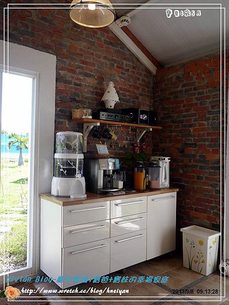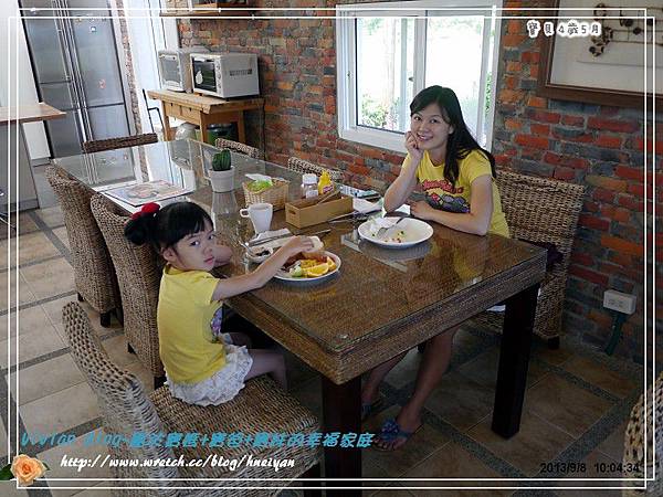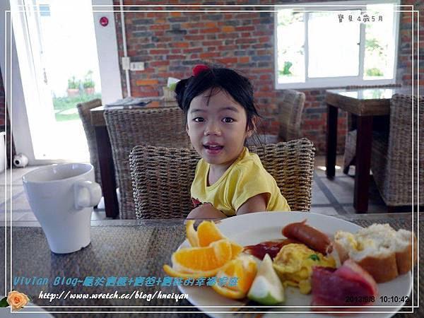 晚上,我們到了恆春老街上覓食,可憐的寶妹已經夯到不行,直接睡在我身上,而我的心也被發燒給煩到不行,因此決定打包食物回到民宿去享用。天際線民宿有個好棒的開放式餐廳,是用紅磚牆砌成,運用褐色及白色等深淺色彩營造出典雅的視覺效果,在裡面用餐真的很舒服。由於這天晚上我和寶爸都因照顧發燒的而沒睡好,因此隔天早上也睡得特別晚,趕在早餐最後一刻,才趕緊起床去餐廳用早餐。